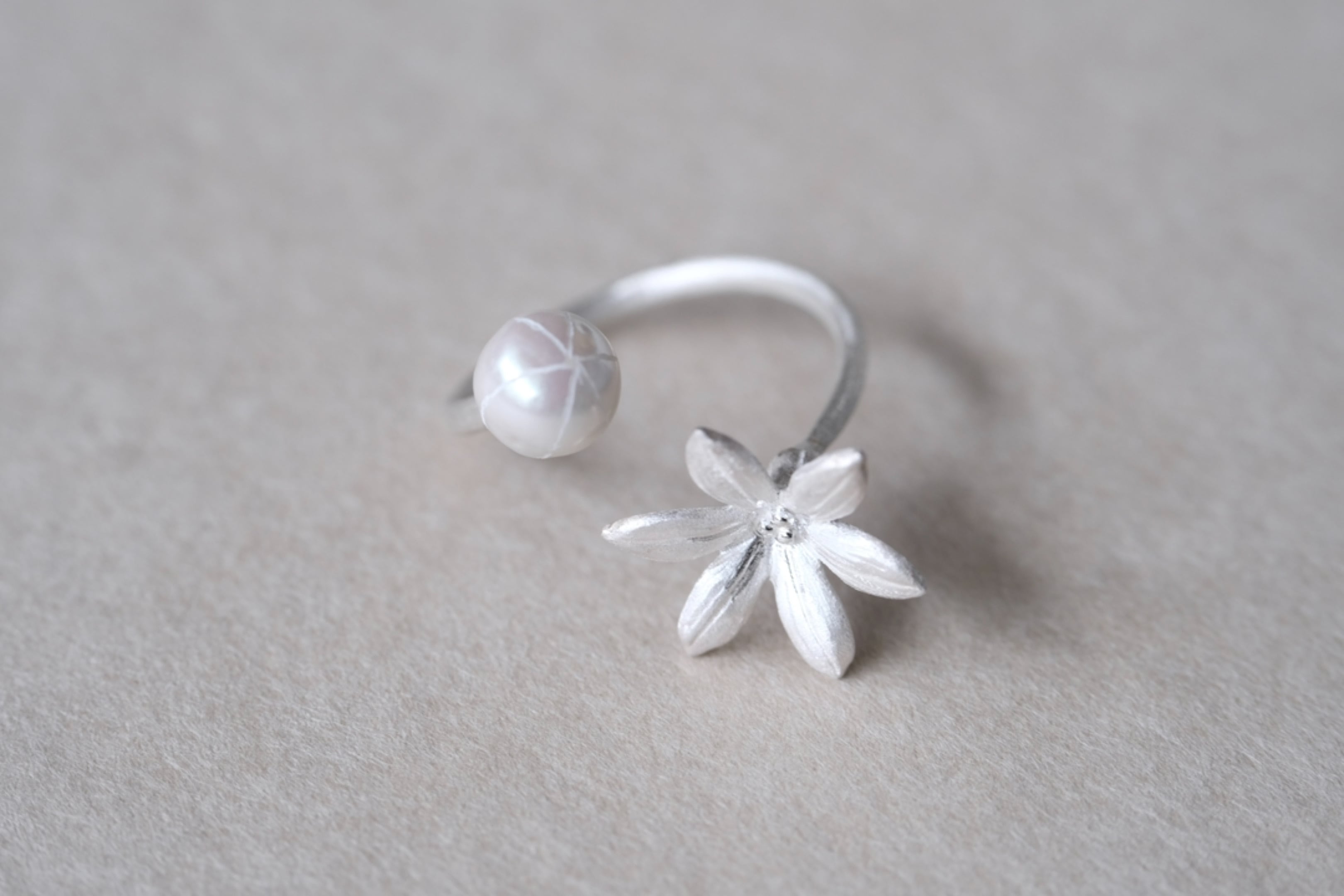 丸い実のような蕾はガラスパールを使用して、さらに線を入れて蕾に見立てています。