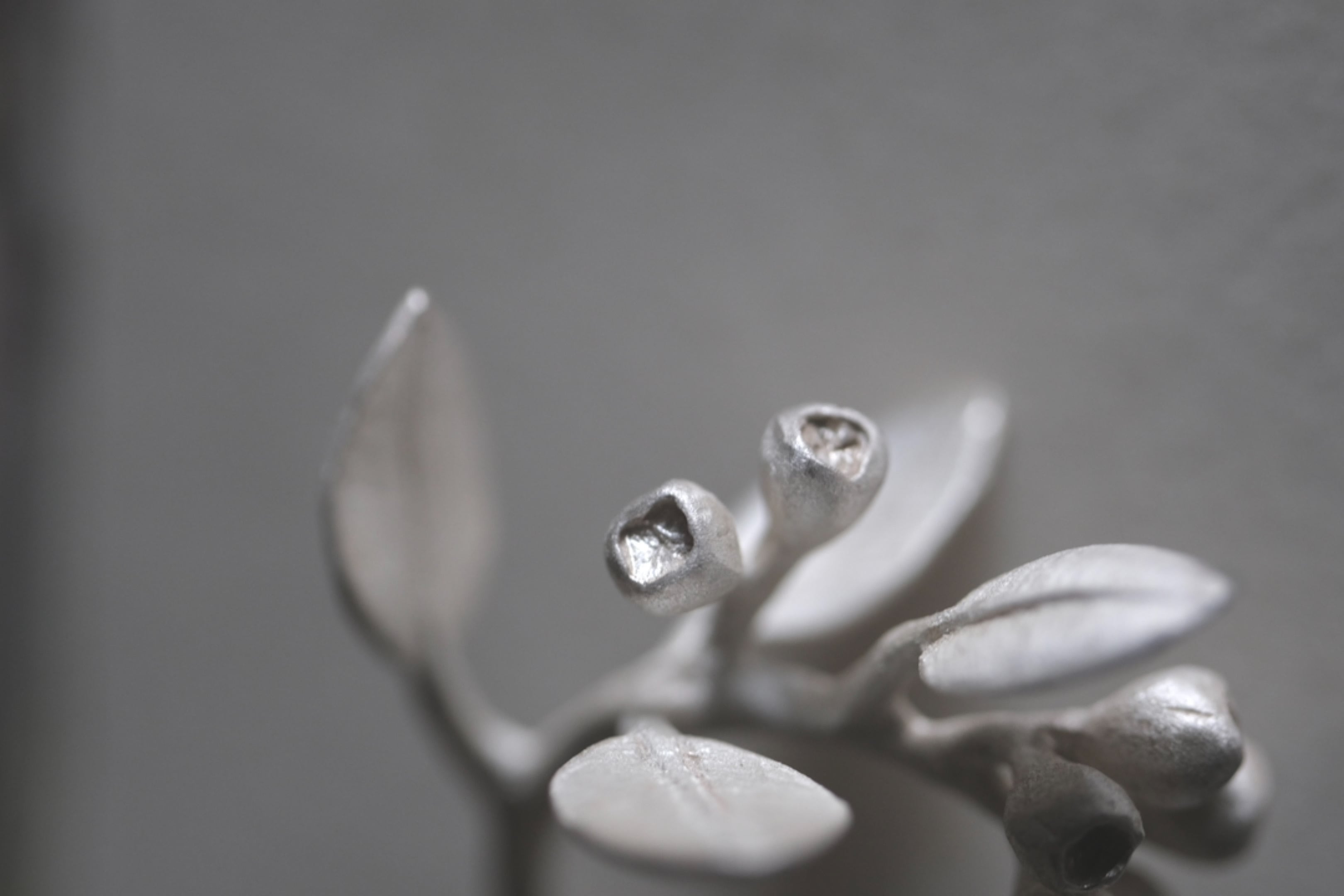 原型制作時にはテクスチャーを入れず、仕上げの際に葉脈などの細かなテクスチャーを入れたり、微調整しながら曲げて植物の自然なラインを出しているため、同じ形でもひとつひとつに個性がでます。同じものはありません。